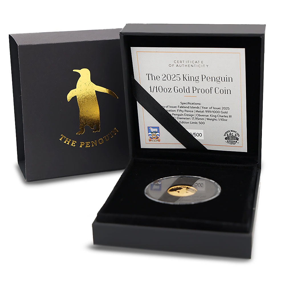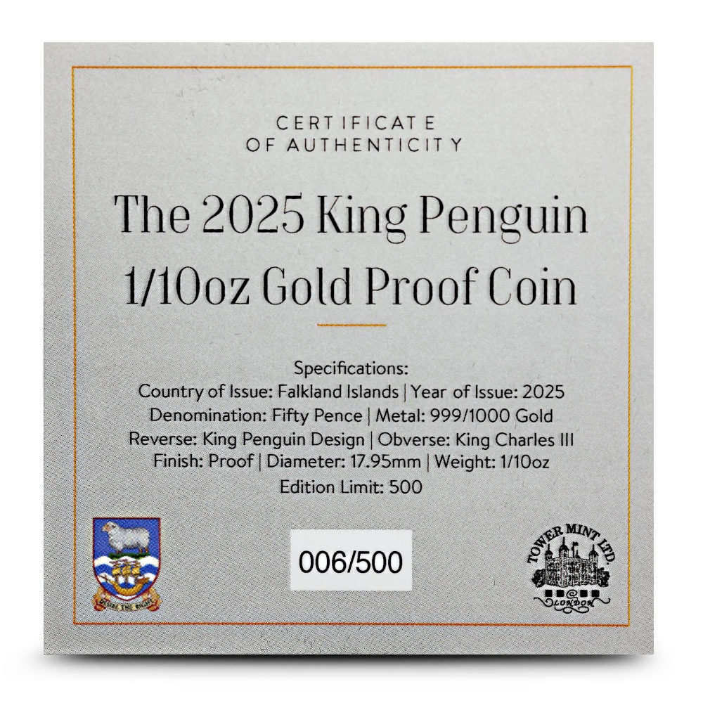 These 2025 1/10 oz Proof Falkland Islands Gold King Penguin Coins are presented in a Tower Mint display case and accompanied by a Certificate of Authenticity. The proof finish provides a striking visual effect, with frosted design elements set against mirrored fields.