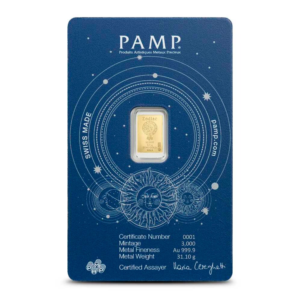Each 1/2 Gram PAMP Suisse Zodiac Aquarius Gold Bar is individually sealed in protective CertiPAMP packaging. These bars are issued as part of a larger Zodiac Series that highlights a unique figure for each zodiac sign, while sharing a consistent reverse design. Production is limited to 3,000 gold bars for each zodiac design.