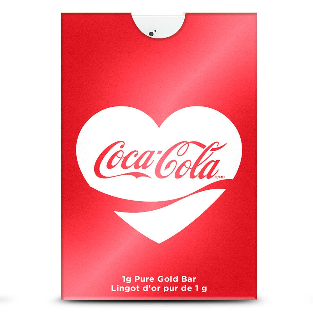 Each 1 Gram Gold Coca-Cola Valentine’s Love Bar is available here sealed in a CertiPAMP assay card. The card packaging includes a white card with a red heart and two Coke bottles on the front. The identifying hallmarks of the product are on the back of the card.