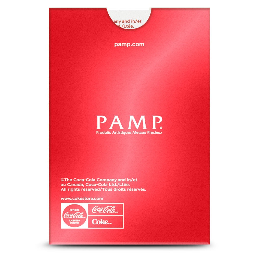 On the reverse of 1 Gram Gold Coca-Cola Valentine’s Love Bars, you’ll find the PAMP Suisse logo and the identifying hallmarks. This side of the bar includes a unique serial number for each piece, as well as the dates 1886 and 2026, referencing the company’s 140th anniversary in 2026.
