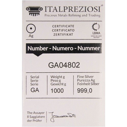 1 Kilo Italpreziosi Cast Silver Bar (New w/ Assay)