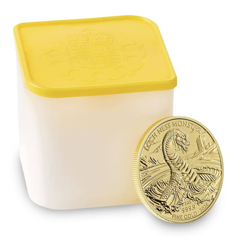 Each 2026 1 oz British Gold Loch Ness Monster Coin available here comes in Brilliant Uncirculated condition. These gold coins arrive individually in plastic flips, with multiples offered in acrylic tubes of 10 coins or Monster Boxes of 100 coins, with a total of 10 tubes per box.