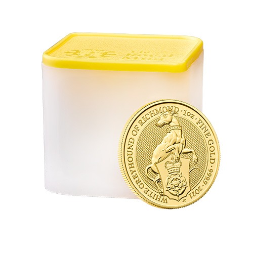 Each of the 2021 1 oz British Gold Queen’s Beast White Greyhound Coins available to purchase here comes in Brilliant Uncirculated condition from the Royal Mint. Individual coins are available with a plastic flip, while multiples come in packaging. These include tubes of 10 coins or Monster Boxes of 100 coins. The Monster Box contains 10 individual 10-coin tubes.