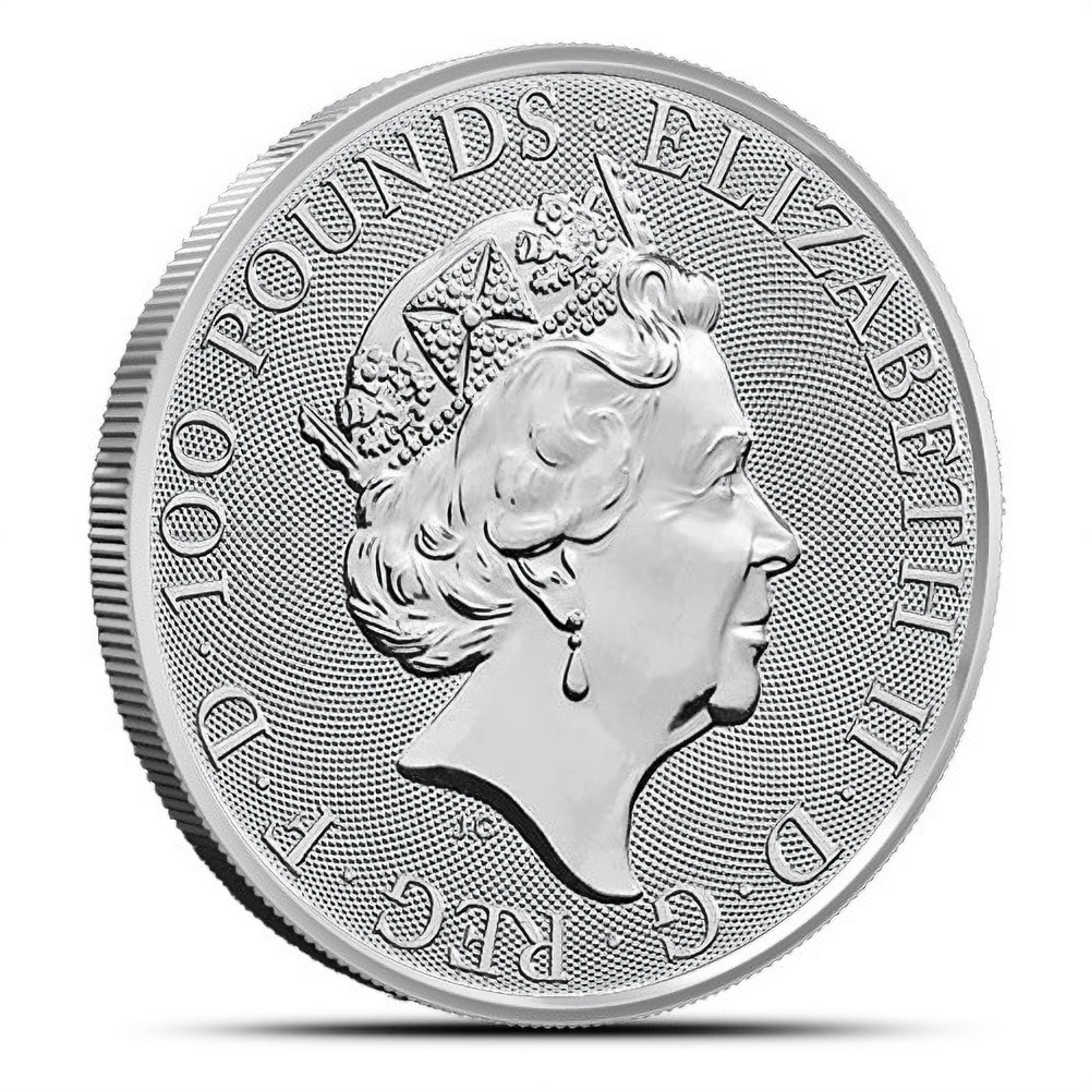 On the obverse of 1 oz Platinum Britannia Coins there is an effigy of Queen Elizabeth II. This image is credited to Jody Clark and features Her Late Majesty facing right with the George IV State Diadem resting upon her head. Beneath the portrait, you’ll find Clark’s initials inscribed. There are other inscriptions as well that read Elizabeth II, D G REG F D, 100 Pounds.