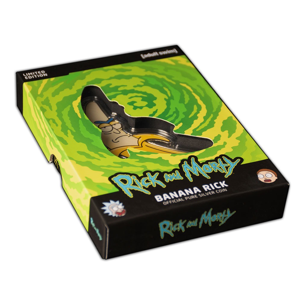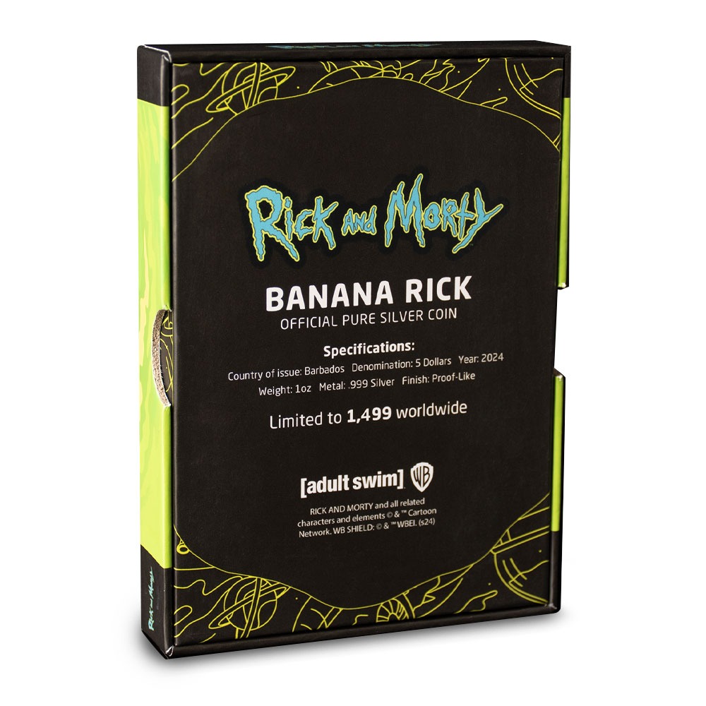 Pickle Rick is an infamous Rick and Morty episode that premiered during season 3 of the hit show. Seeing Rick Sanchez as a pickle has inspired art featuring the eccentric scientist as other objects. Now, you can experience Rick as a banana with this new 2024 1 oz Colorized Barbados Silver Rick and Morty Banana Rick Shaped Coin. Secure your piece of colorized silver right here.