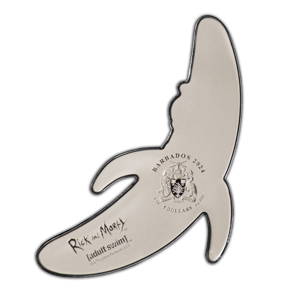 The Barbados coat of arms is present on the obverse side of the 2024 Colorized Barbados Silver Rick and Morty Banana Rick Shaped Coin. The emblem is shown in the middle, while further information such as the television program and brand that created the character is shown beneath it.