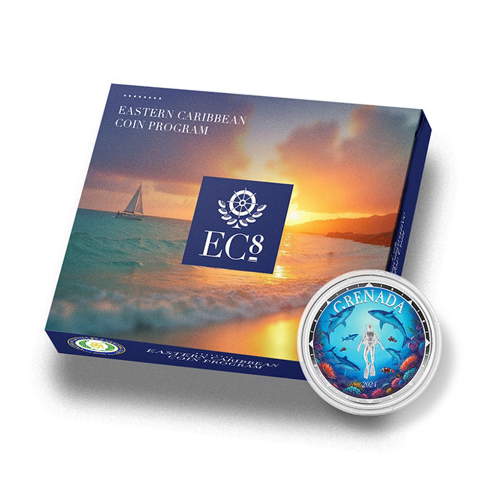 Scottsdale Mint’s EC8 Series highlights the rich natural landscapes and cultural identity of the Caribbean islands. Named after the eight island nations under the Eastern Caribbean Central Bank (ECCB), the collection showcases annually changing reverse designs specific to each participating country. Right now, 2024 1 oz Colorized EC8 Silver Grenada Shark Diver Coins are available.