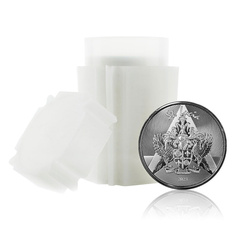 Your 2023 1 oz EC8 Silver St. Lucia Coat of Arms Coin is available in Brilliant Uncirculated condition. The coins are individually packaged in flips, in plastic tubes for multiples of 20, or Monster Boxes of 500 coins with 25 tubes inside.