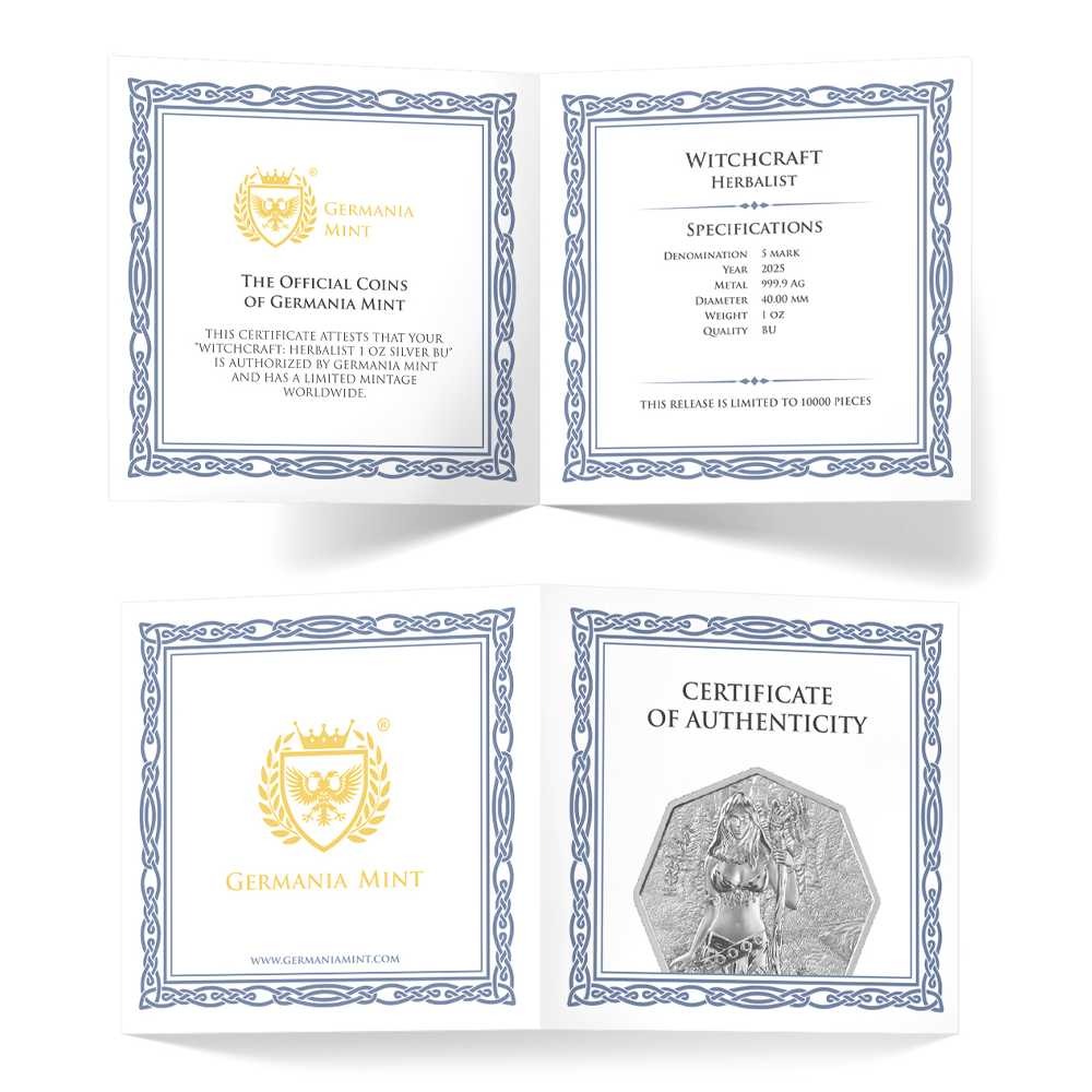 Each 2025 1 oz Germania Mint Witchcraft Herbalist Silver Round is available here with a protective capsule and comes with a Certificate of Authenticity. This round is the second in the Withcraft Series and is accompanied in the collection by a gilded, antique piece and an ultra-high relief specimen.