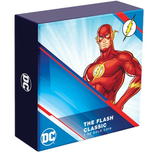 The coin’s reverse side features the Flash striking a powerful pose alongside his iconic lightning-bolt logo. It also includes inscriptions verifying the coin’s weight and contents and the copyright and trademark of DC.