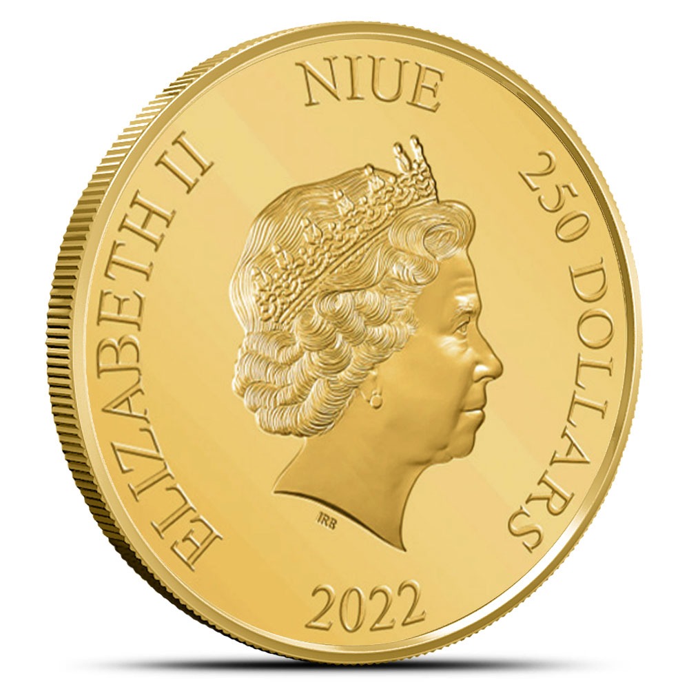 Queen Elizabeth II’s effigy as designed by Ian Rank-Broadley features on the coin’s obverse side, confirming it as legal tender. It’s accompanied by the inscriptions “ELIZABETH II,” “NIUE,” “250 DOLLARS” and “2022.”