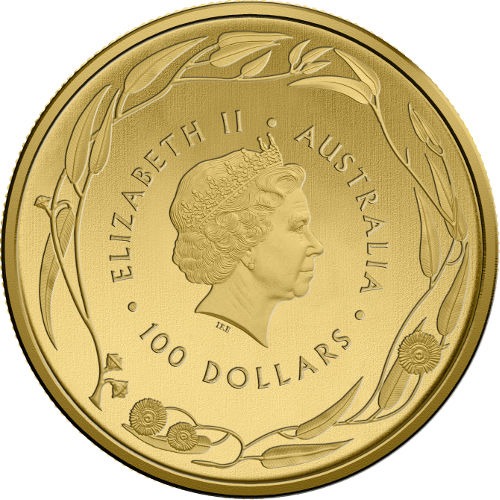 The obverse includes the right-profile portrait of Queen Elizabeth II. Created in 1998 by Ian Rank-Broadley, this depiction is the fourth-generation representation of Her Majesty to appear on commonwealth coinage since she ascended to the throne in 1952. Simple engravings of “Elizabeth II,” “Australia,” and “100 Dollars” accompany her effigy.