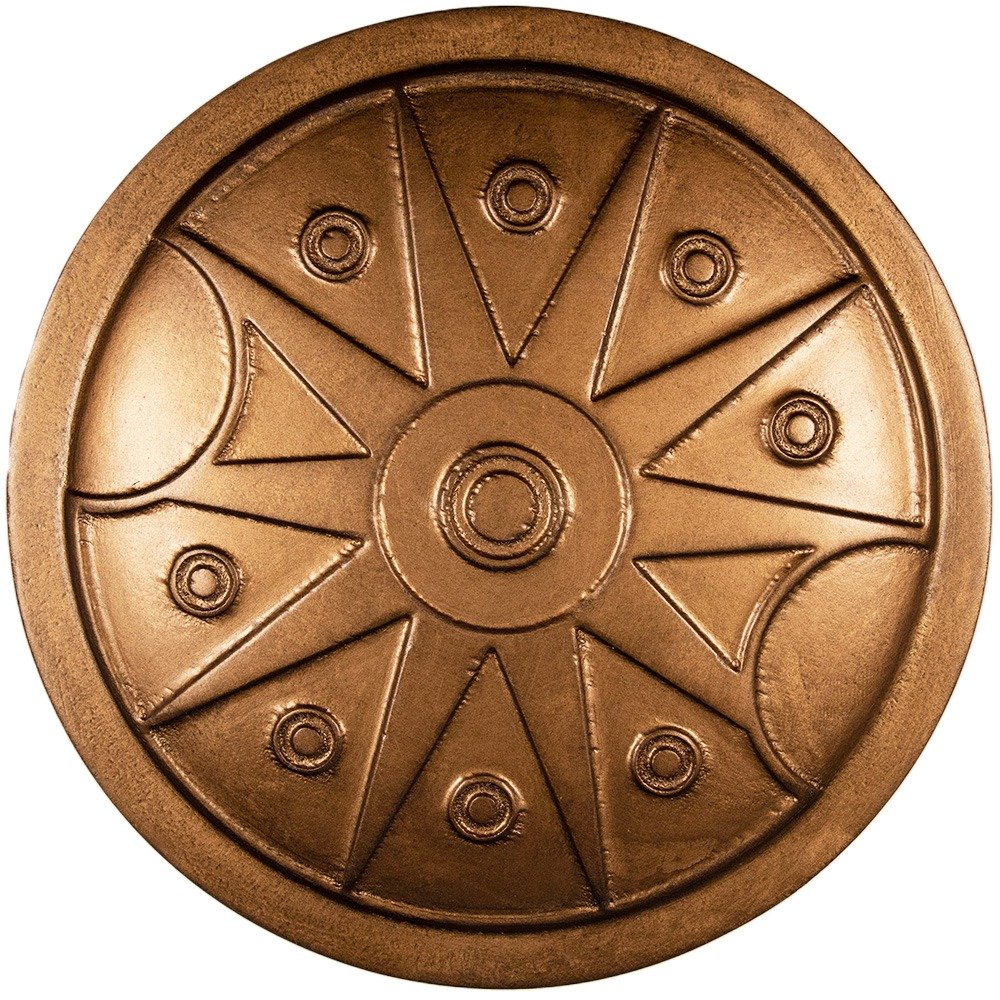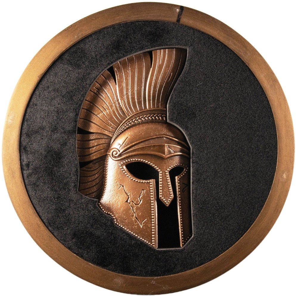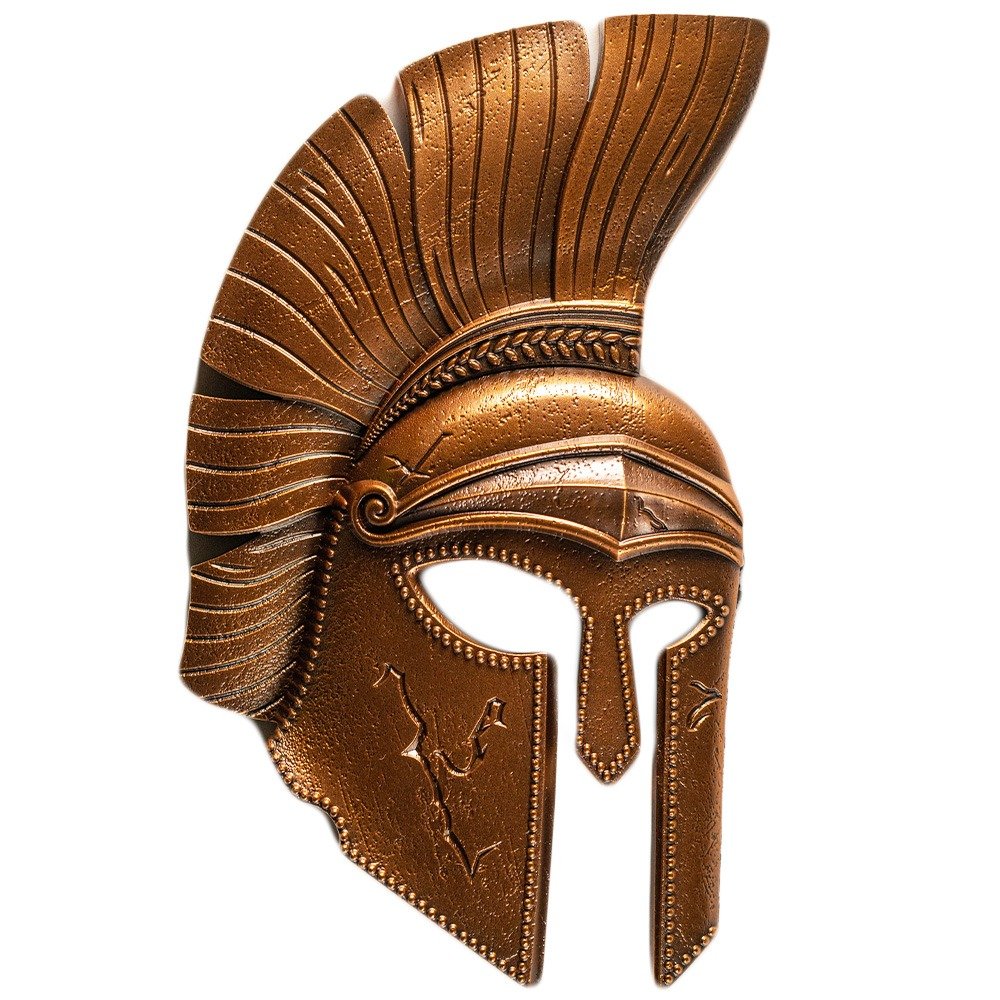 For the reverse field of the 2023 10 oz Antique Solomon Islands Silver Trojan Helmet Shaped Coin, the image of a helmet is engraved. The coin is structured in the shape of a Trojan helmet. It has a bronze color finish and hair thongs at the back of the helmet that stretch from the bottom to the top.