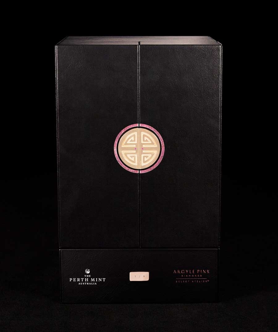 The doors of the display case feature two 18-carat gold plates with an Argyle pink diamond on each side. The case also features an individually numbered 18-carat rose gold plaque, which corresponds to the Certificate of Authenticity.