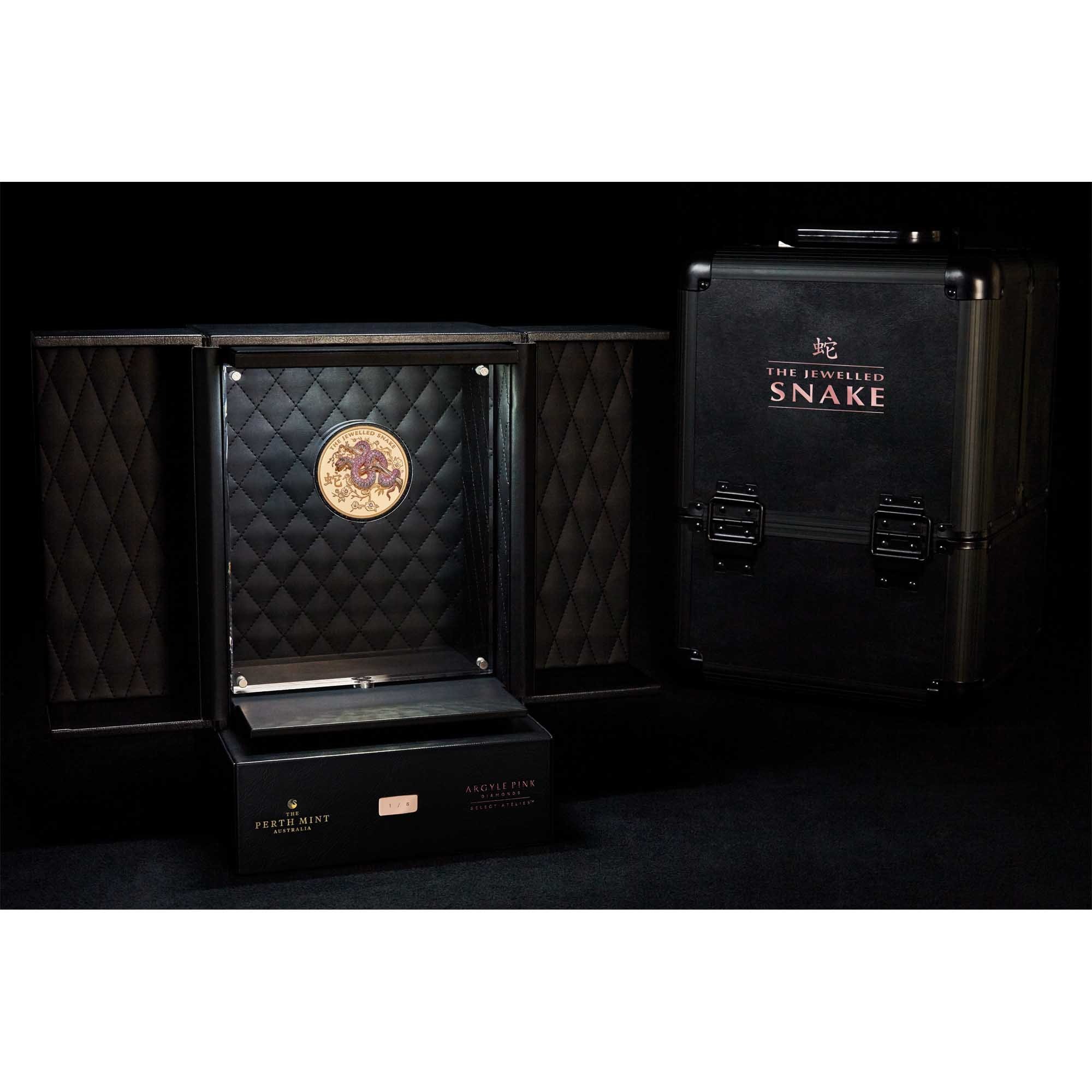 The Perth Mints most luxurious annual releases, henceforth known as Masterpieces, owe their artistic inspiration to animals and mythological creatures significant in oriental culture. Like its stunning predecessors – The Jewelled Snake is mounted with a three-dimensional 18-carat rose and yellow gold representation of a snake coiled about a tree branch. Associated with wealth, strength, and wisdom, the snake is embellished with 175 exceptionally rare, hand set Argyle Pink Diamonds™ on its upper body. The creature’s belly is similarly pavé-set with 111 white diamonds, with two emeralds for its eyes.