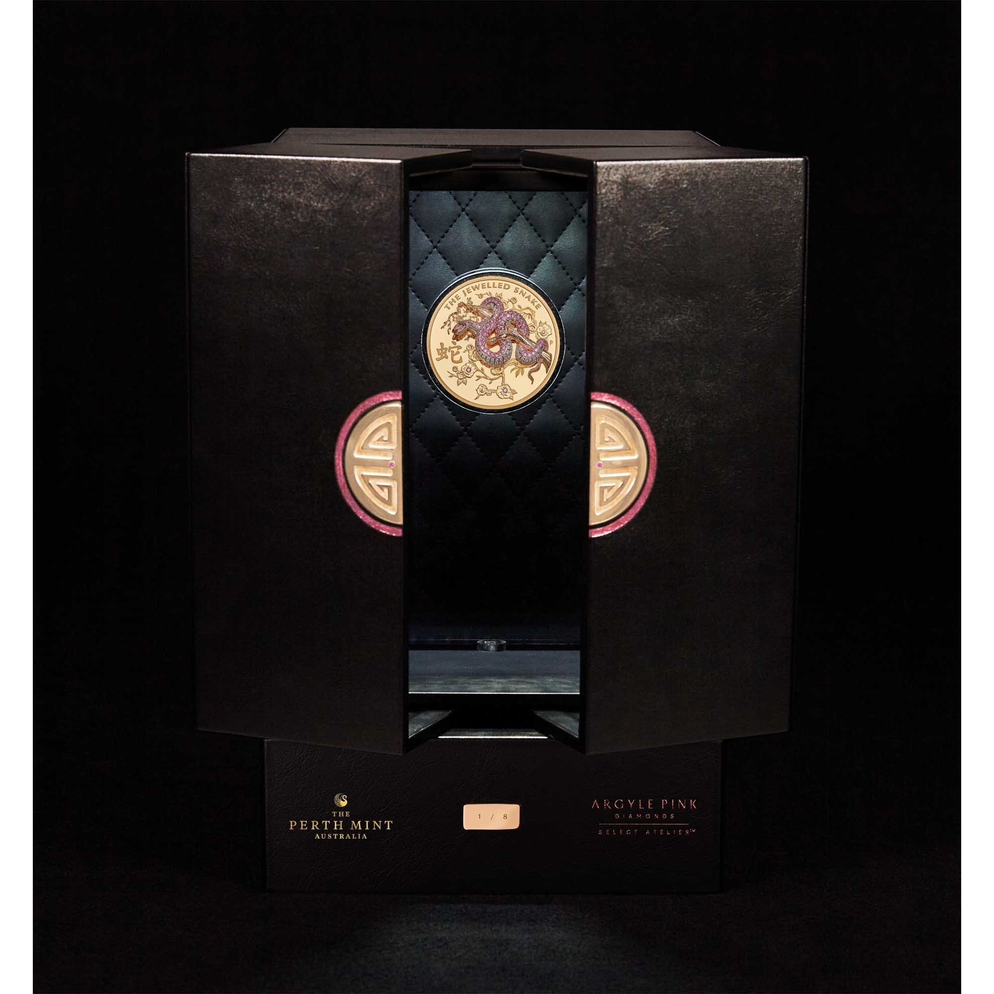 Finished in flawless proof quality, the coin’s artistry includes floral motifs representing plum tree blossom – a noble flower in Asian cultures associated with rebirth and renewal. Additional Argyle Pink Diamonds™ are set at the heart of three flowers. Also included in the design is the inscription ‘THE JEWELLED SNAKE’, the traditional Chinese character for snake, and The Perth Mint’s ‘P’ mintmark.