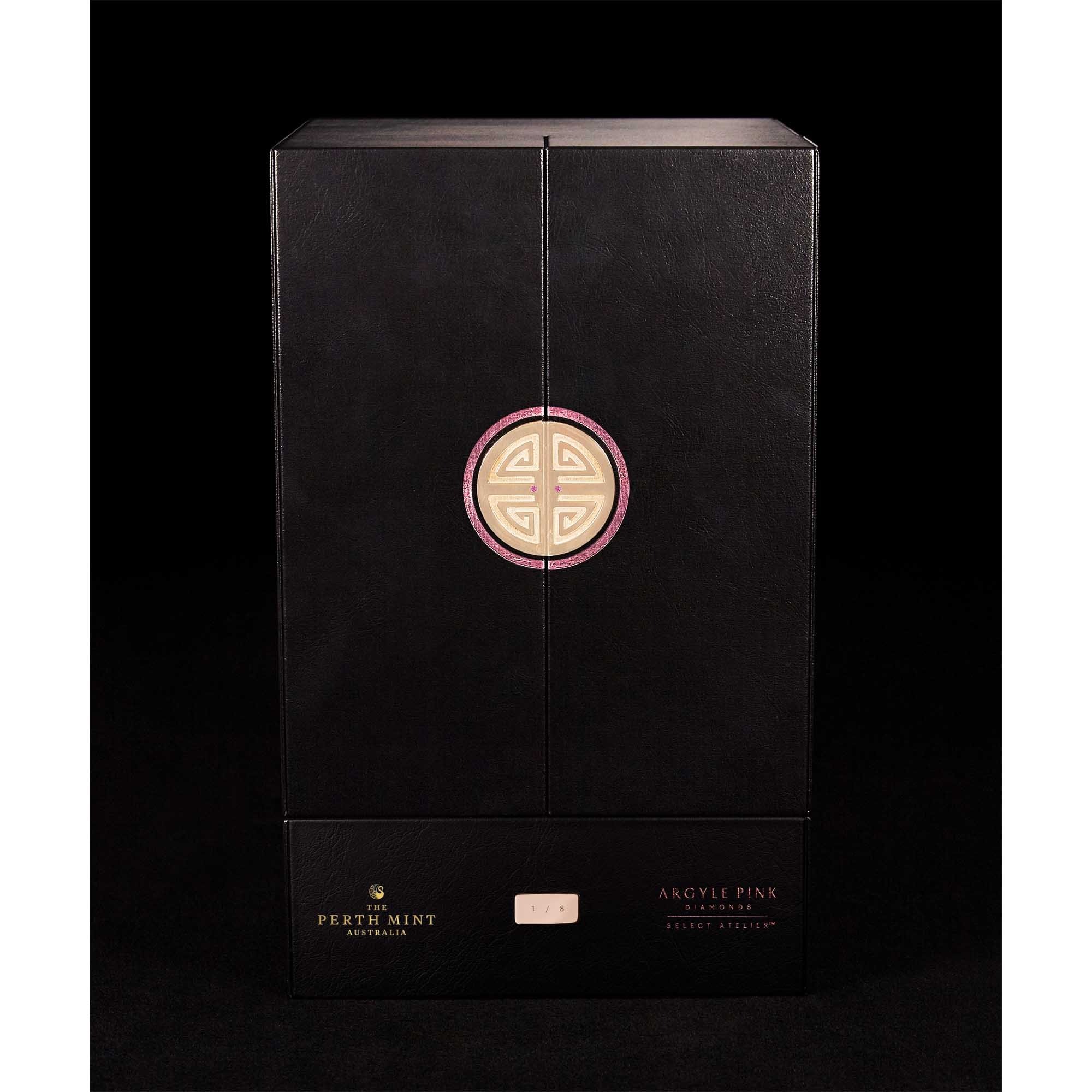 The coin is presented in a luxury display case featuring double-doors embellished with pink gold motifs and two additional Argyle Pink Diamonds™, one on each side. Inside, the illuminated coin continuously rotates through 360 degrees with captivating style. Accompanied by an individually numbered 18-carat rose gold plaque, corresponding to each coins numbered certificate of authenticity, just eight of these stunning objets d’art will be released.