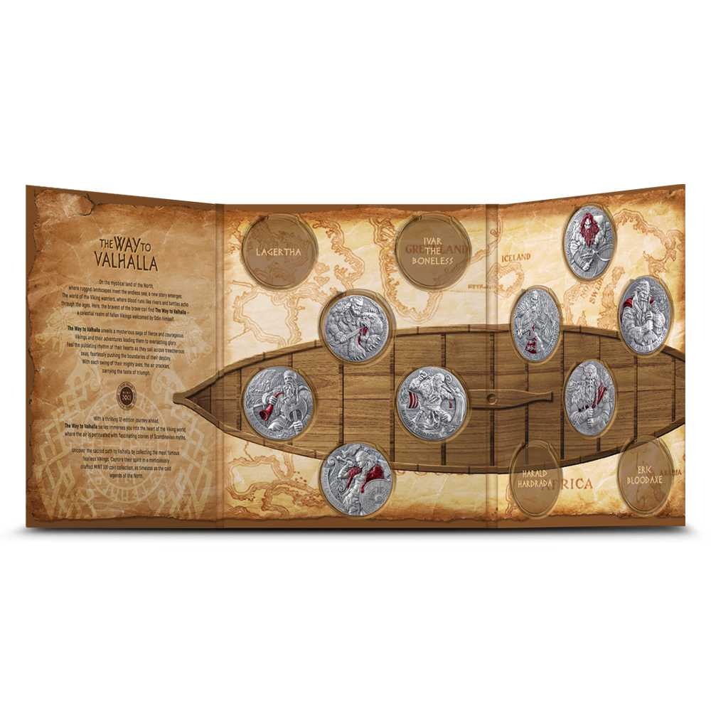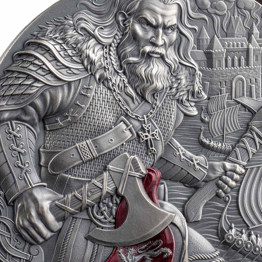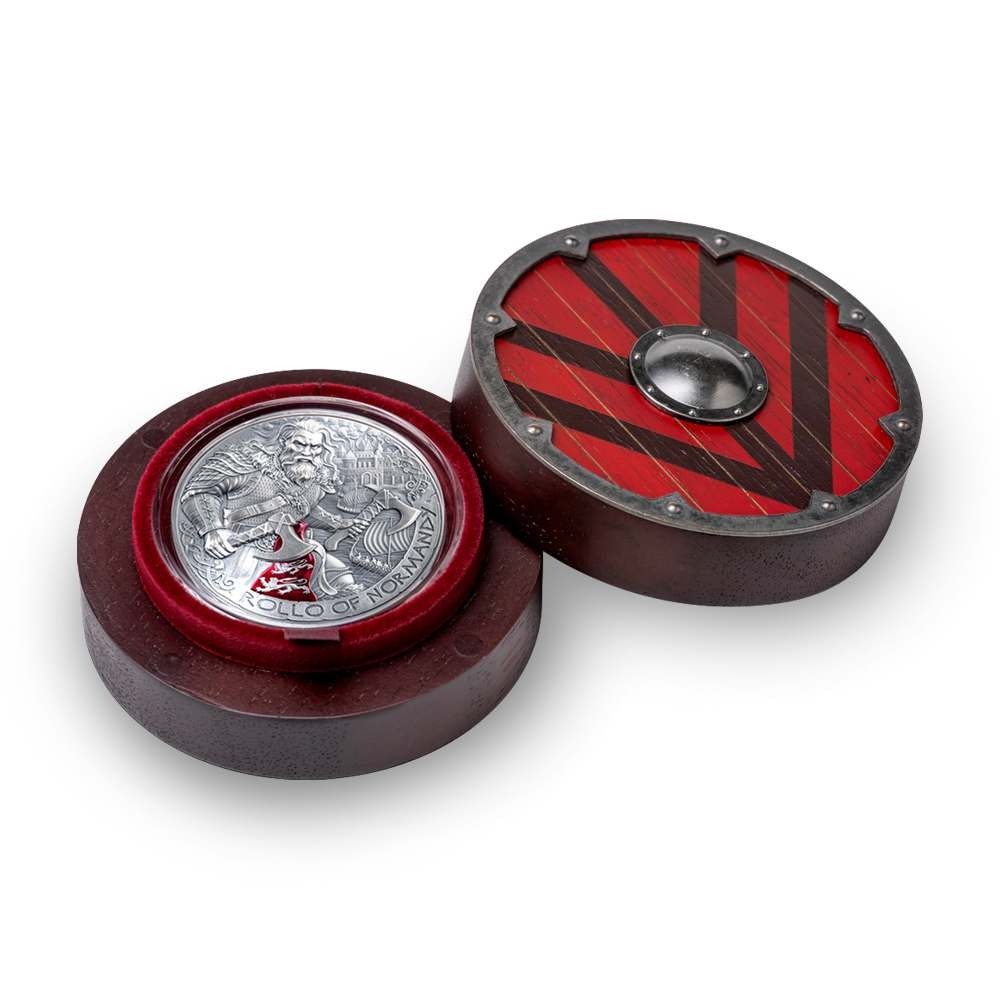 Each 2026 2 oz Antique Cameroon Silver The Way to Valhalla Rollo of Normandy Coin comes with a presentation box and a Certificate of Authenticity. The entirety of the coin is finished with a beautiful antique polish, while the design strike on the obverse is produced in high-relief for greater 3D impact. There is a splash of red colorization on Rollo’s sash on the obverse.