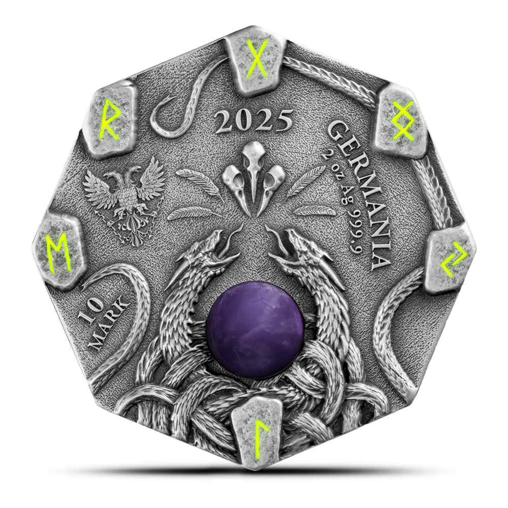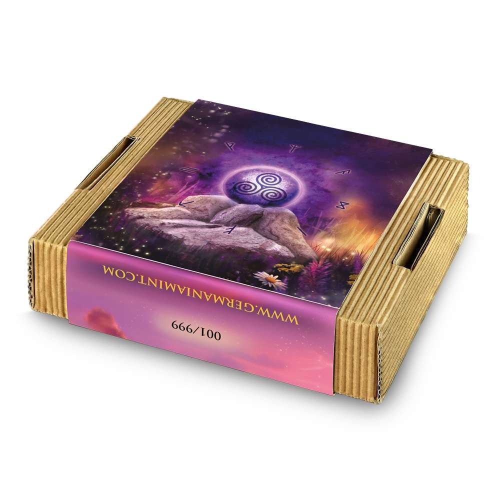 On the reverse of the 2025 Germania Mint Witchcraft Herbalist Silver Rounds is the official seal of the Germania Mint. The familiar double-headed eagle appears within a natural landscape, reflecting the realm from which the Herbalist draws her strength. Surrounding the central design are runes that symbolize protection and health.