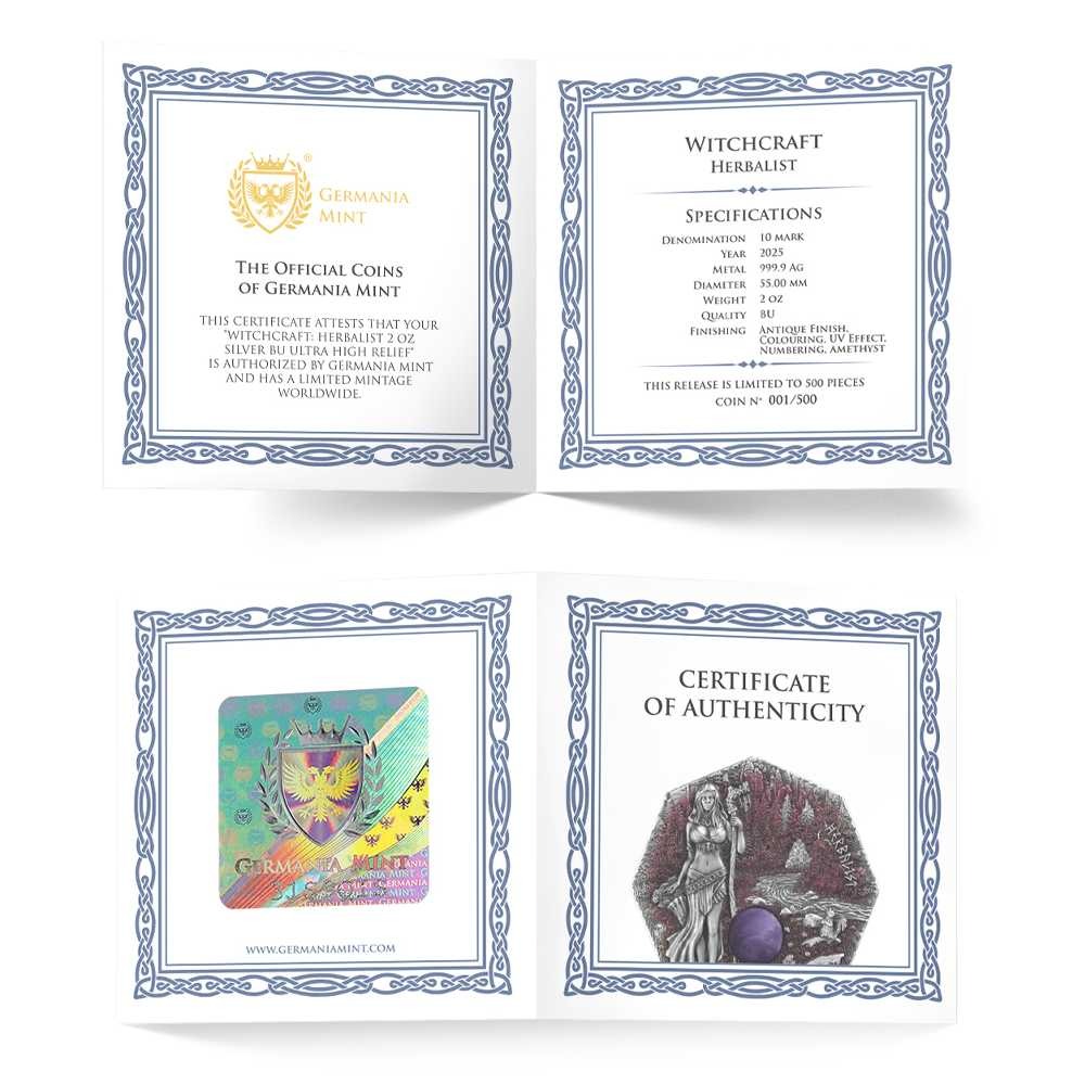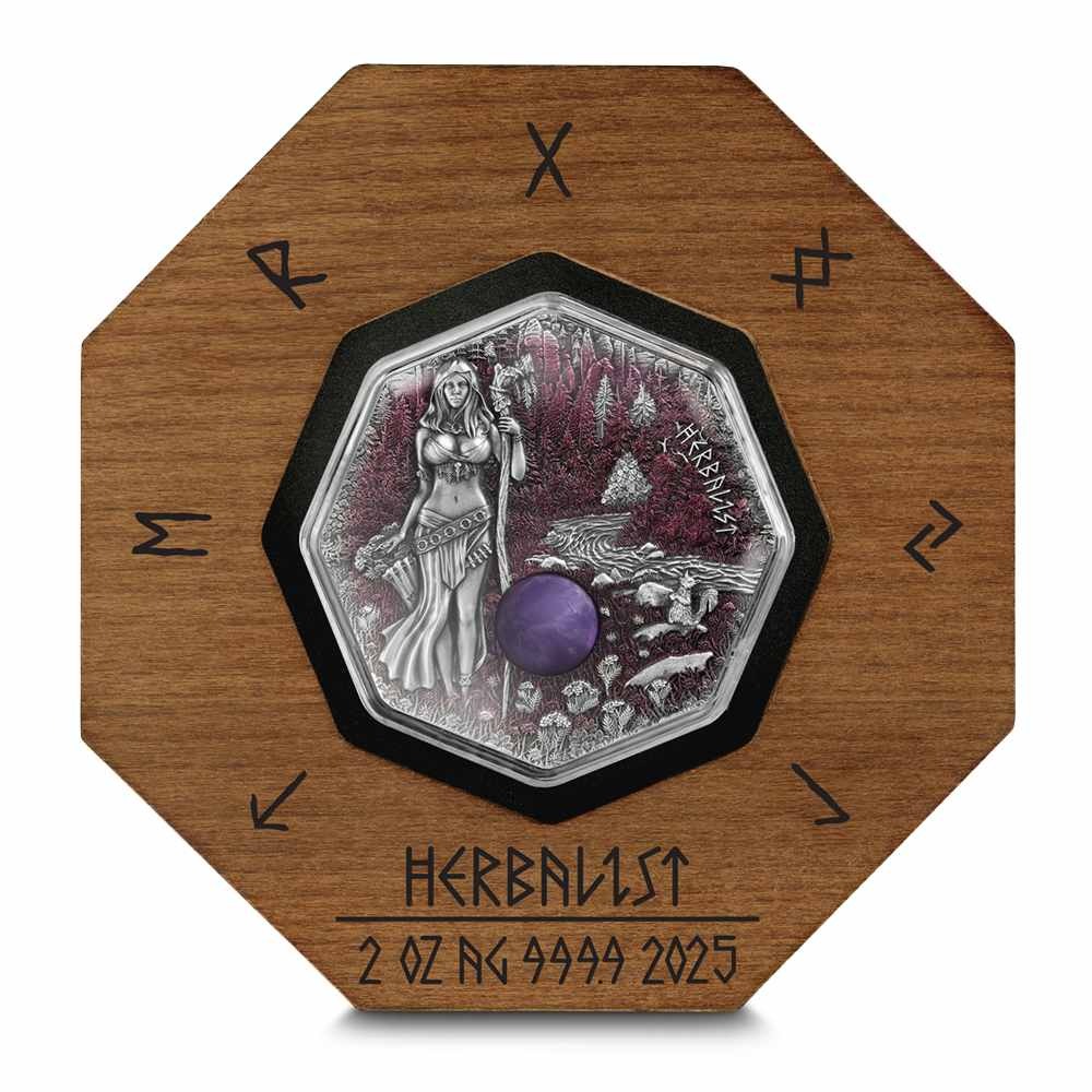 These 2025 2 oz Germania Mint Witchcraft Herablist Silver Rounds come with capsules and are packaged in octagonal beauty boxes with a wooden display. There is a Certificate of Authenticity available with each round. The pieces feature an antique polish with selective colorization and an inset amethyst.