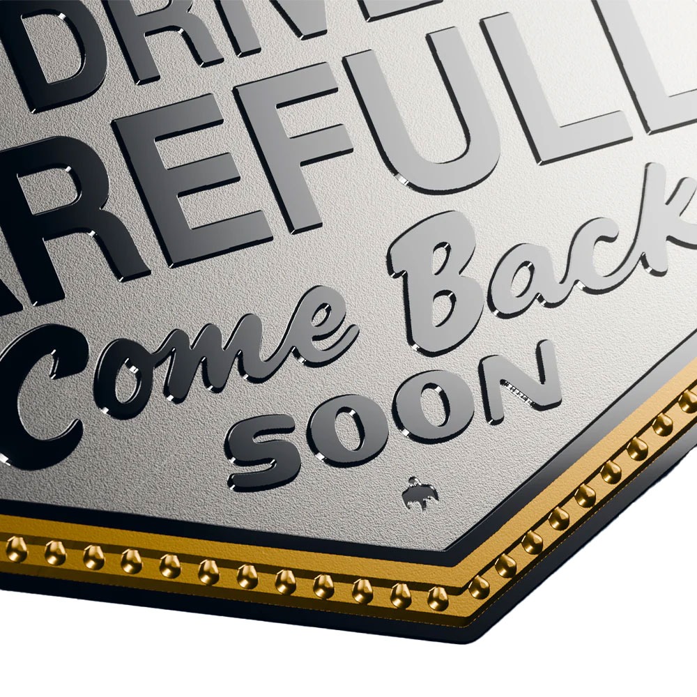 The obverse of 2026 Proof Colorized Niue Silver Welcome to the Fabulous Las Vegas Shaped Coin comes with the Public Seal of Niue at the top of the sign. This side of the coin features a message that reads “Drive Carefully Come Back Soon” in a similar style. This farewell message reinforces the hospitality theme while adding a practical safety reminder for departing visitors.