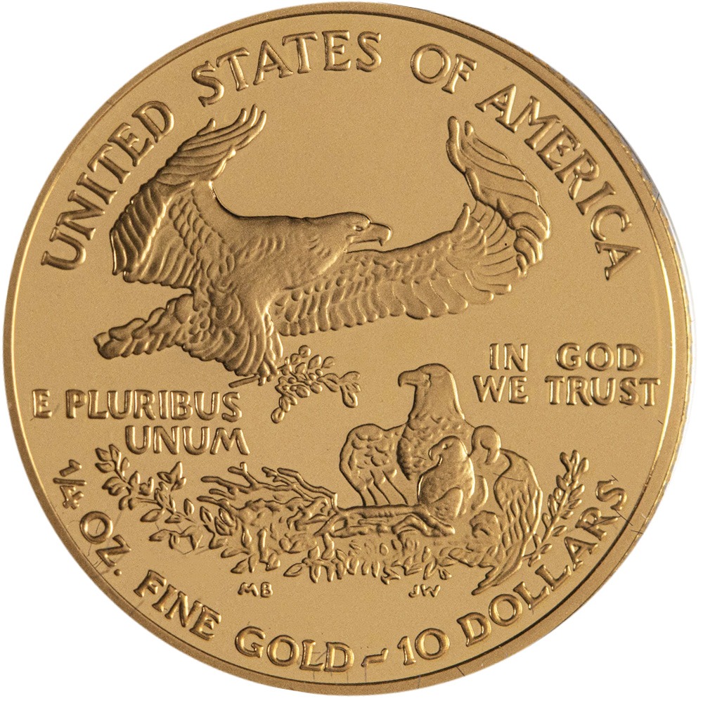On the reverse of each coin from the 2001-W 4-Coin Proof Gold Eagle Set is a depiction of a family of eagles, with the male eagle carrying an olive branch in its talons and flying over the nest where the female and her hatchlings reside.