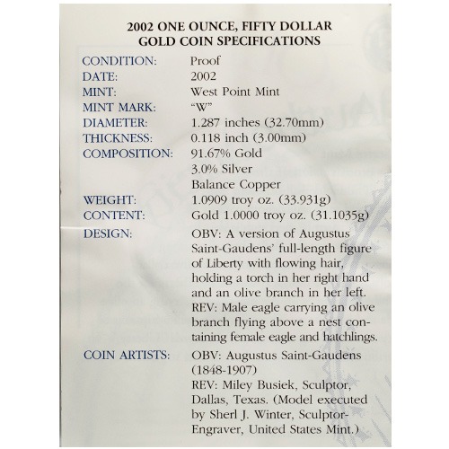 A family of bald eagles is featured in the reverse design of 2002-W Proof American Gold Eagle Coins. This image was created in 1986 by Miley Busiek and depicts a male eagle soaring over the nest as a female guards hatchlings within the nest.