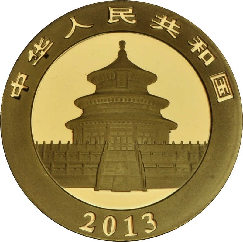 A beautiful 2013 1/4oz gold Panda coin from China, with a face value of 100 Yuan. The design on this reverse of this coin is changed every year.
