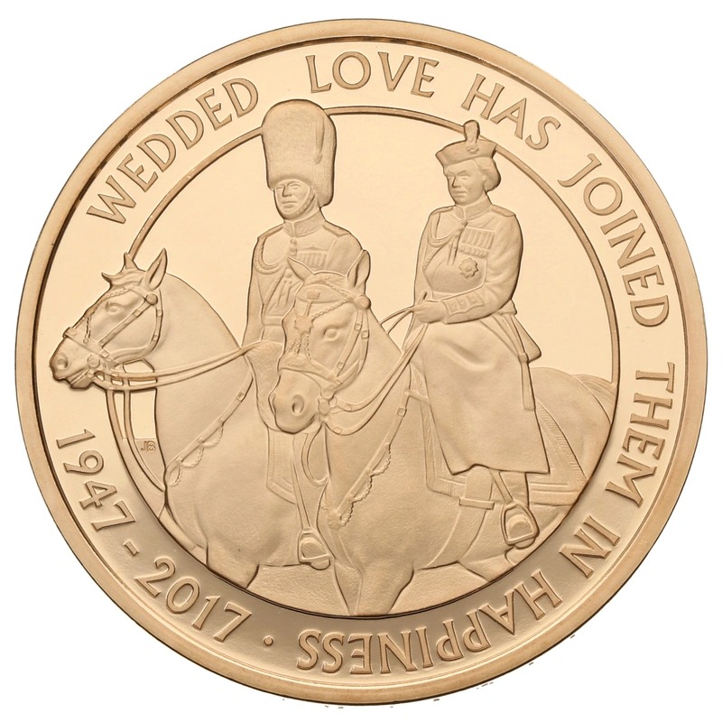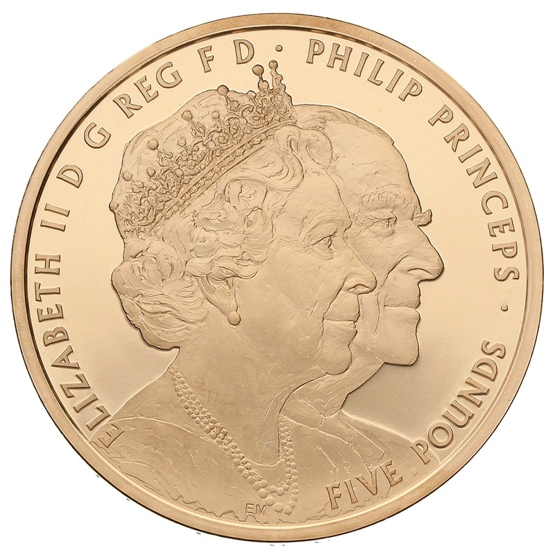 This gold proof £5 coin (aka Quintuple Sovereign, or gold Crown) was issued to celebrate the Platinum (70th) wedding anniversary of Queen Elizabeth II and Prince Philip.