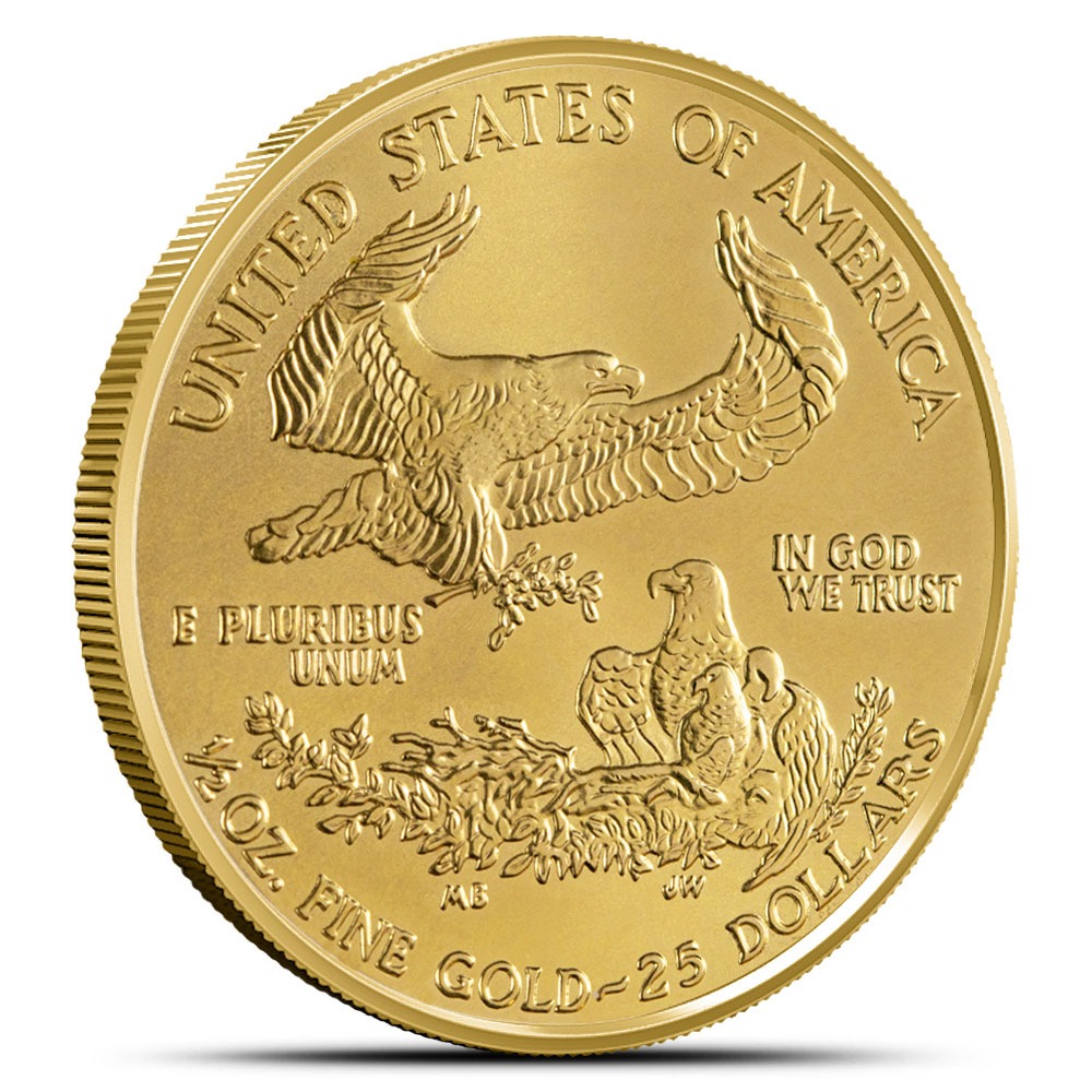 The United States Mint offers the American Gold Eagle bullion coins in a total of four different weights. The 1 oz gold coin and 1/10 oz coin are often the most popular, with the 1/2 oz and 1/4 oz coin still attracting their fair share of interest from gold buyers. Today, 2019 1/2 oz American Gold Eagle Coins are available to you online.