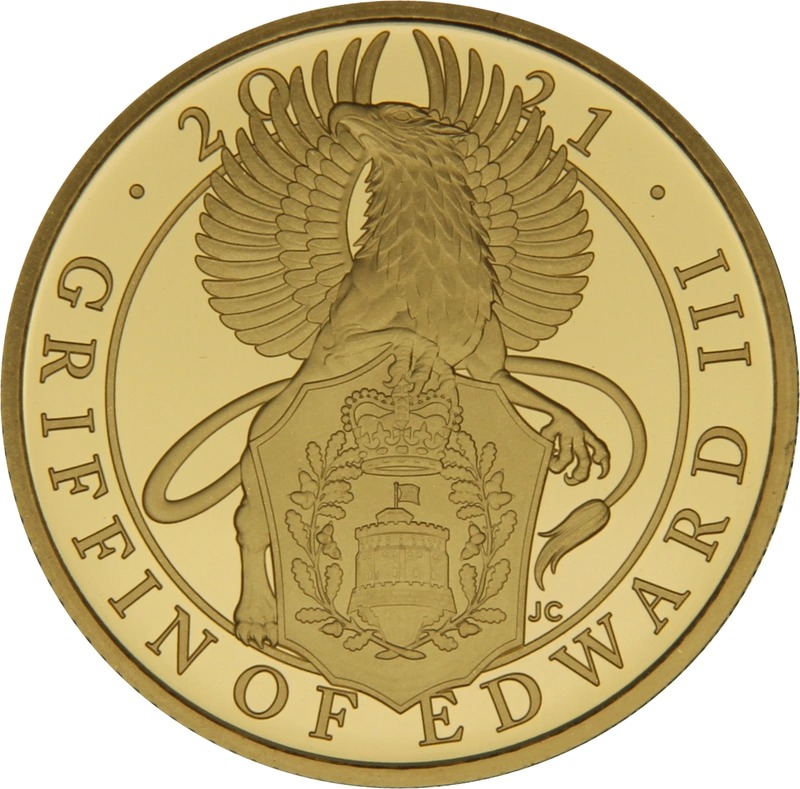 A 2021 Proof 1/4oz Griffin of Edward III gold coin from the Queens Beasts series. Supplied in the original box with certificate.
