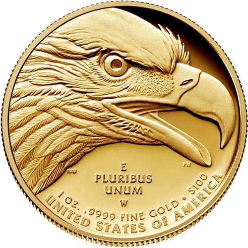 The reverse side of the 2021-W American Gold Liberty High Relief Coin features an American bald eagle. Here, the symbol of the nation is depicted in right-profile relief with its beak slightly open. The bald eagle was chosen by the Founding Fathers to be an enduring symbol of the nation because of its majesty, power, and longevity.