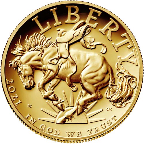 On the obverse of 2021-W 1 oz American Gold Liberty High Relief Coins is an image of a powerful mustang. This horse is working hard to buck off the Western-style saddle on its back as the sun rises into the design field beneath its figure. The action of the horse is representative of America shaking off the controls of British tyranny in the 18th century to earn independence and form a new nation with democratic ideals and Liberty.
