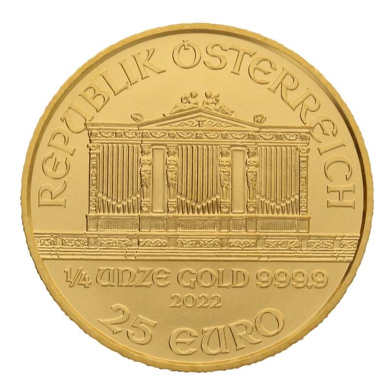 A 2022 quarter ounce Austrian Philharmonic 24 carat gold coin.