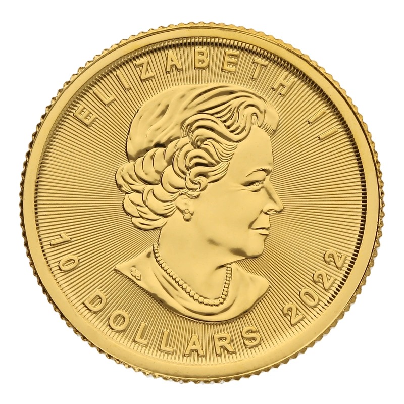 This 2022 1/4oz gold Maple coin has a face value of $10 and is struck with 999.9 fine gold.