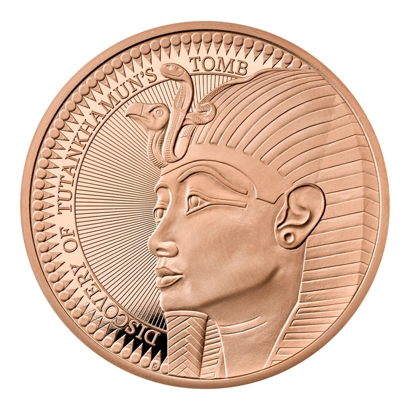 The reverse features a design by Laura Clancy which is based on Tutankhamun’s famous gold mask. The obverse of the coin features Jody Clark’s Fifth Portrait of Her Majesty Queen Elizabeth II, making this one of the final coins to depict Her Majesty.
