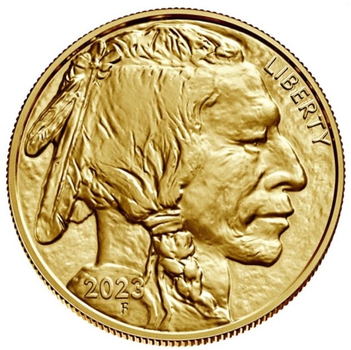 The 2023 American Buffalo is an American gold coin, minted by the United States Mint. The weight of the coin is 31.1 grams with a fineness of 999.9 (24 carat gold), this means it contains 31.10348 grams of pure gold. The diameter of the coin is 32.7 mm. The American Buffalos have a face value of 50 Dollars and are legal tender in America.