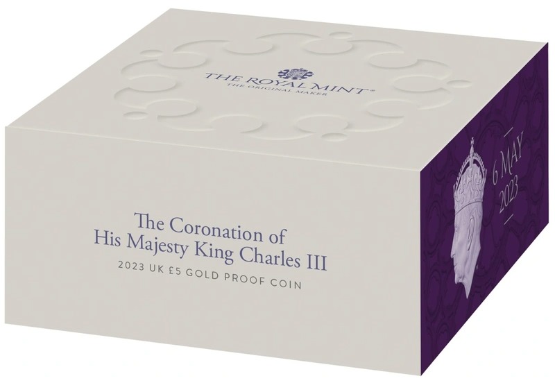 We are proud to present this 2023 £5 Gold Proof Crown to mark the occasion of the coronation of King Charles III. The coin features a crowned coinage portrait of King Charles III on the obverse side, created by artist Martin Jennings. The reverse side features a design by celebrated coinage artist Timothy Noad, depicting symbols of the coronation ceremony.