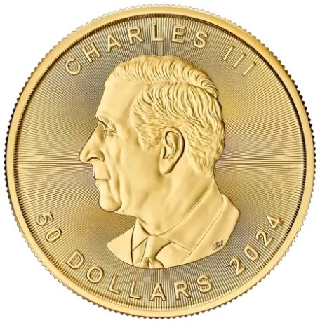 The 2024 1oz gold Maple coin contains one troy ounce of pure 999.9 gold, and has a face value of 50 Canadian Dollars. It is the first coin in the series to feature the King Charles III effigy designed by Steven Rosati.