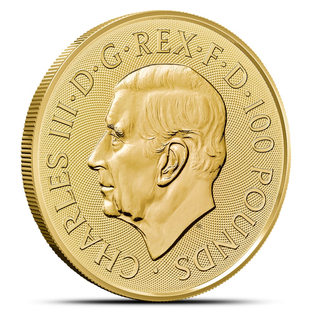 On the obverse of 2025 British Gold St. George and the Dragon Coins, you’ll find a portrait of King Charles III. This left-profile effigy shows Charles III without a crown on his head. The design was created for The Royal Mint in 2022.