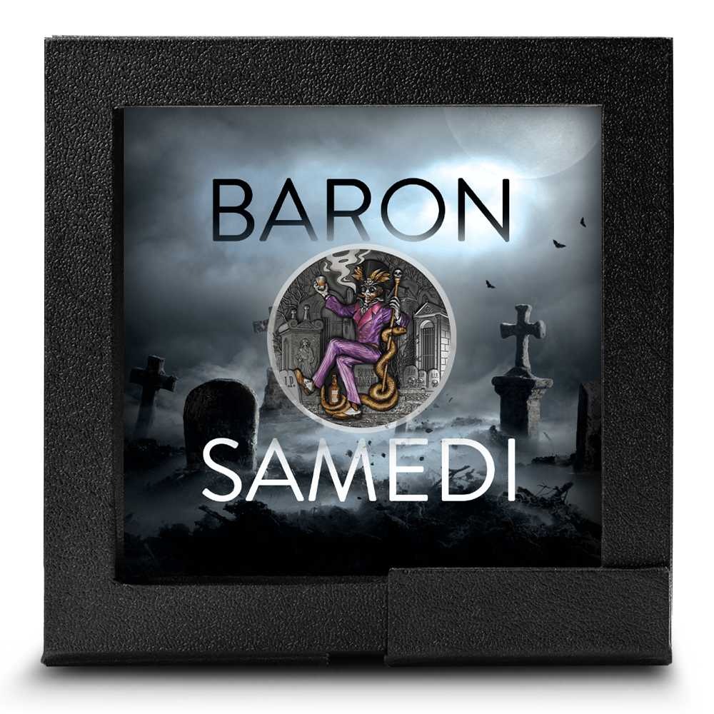 Baron Samedi is one of the most recognizable and powerful loa (spirits) in Haitian Vodou, serving as the master of the dead and guardian of cemeteries who controls the passage between life and death. Despite his association with mortality, Baron Samedi is also invoked for healing, particularly for terminal illnesses, as only he has the power to accept or refuse a soul’s passage to the afterlife. Today, 2025 2 oz Antique Colorized Cameroon Silver Baron Samedi Coins are available.