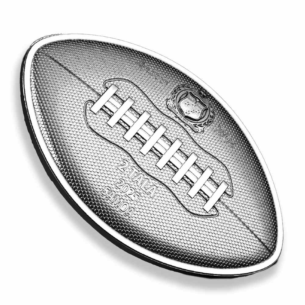 These 2025 2 oz Antique Samoa Silver Touch Down Coins are available with protective capsules and come with a Certificate of Authenticity. The coin is shaped like a modern football and has an antique polish applied to all surfaces.