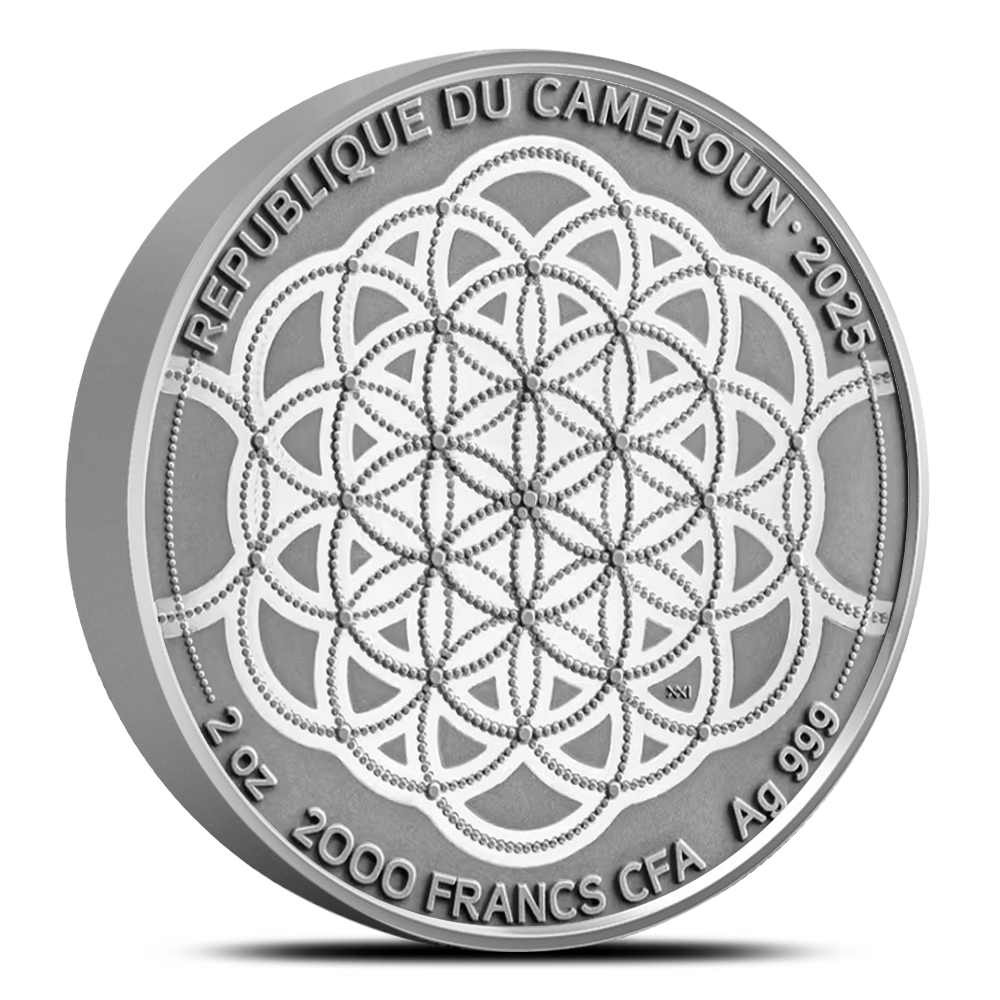 The obverse of 2025 Colorized Antique Cameroon Silver American Bisons comes with a depiction of an ornate tapestry design. Drawing inspiration from indigenous artwork, the design offers an appealing, concentric tapestry.