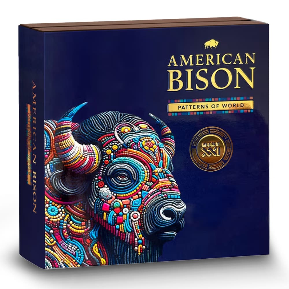 Each 2025 2 oz Colorized Antique Cameroon Silver American Bison Coin comes with a presentation box and a Certificate of Authenticity. The coin features a high-relief strike on the reverse, with ornate tapestries on both sides that reflect the ancestral artistry of America’s indigenous tribes.