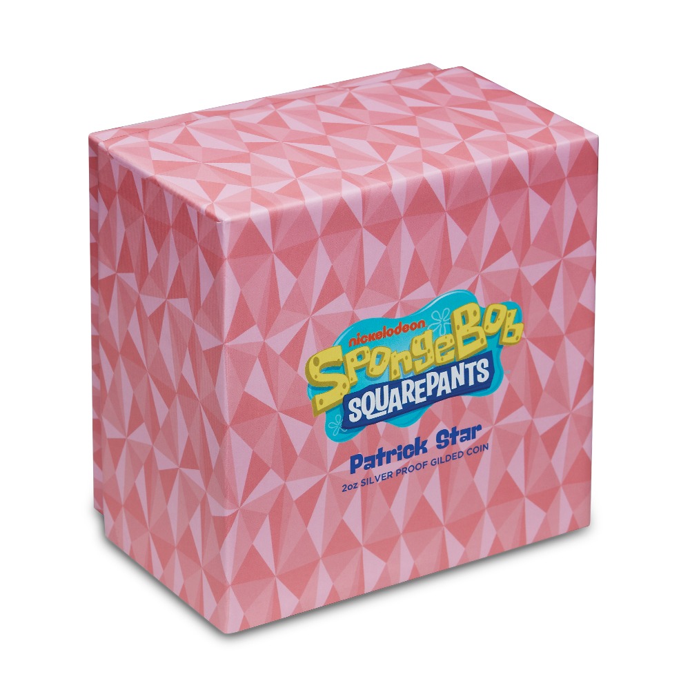 All 2025 2 oz Proof Tuvalu Silver SpongeBob SquarePants Patrick Star Coins come with a special presentation box styled after Patrick’s rock in Bikini Bottom. The box arrives in a SpongeBob-themed shipper with a Certificate of Authenticity. The coin features a pink gold layer on the image of Patrick and the edge of the coin.