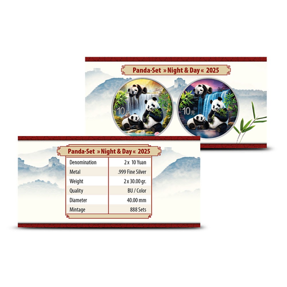 The Day-Night Set is one of the most popular issues of the Chinese Silver Panda. Each year, the annual design of the Silver Panda is enhanced by Emporium Hamburg with unique colorization. One coin is finished with colorization that captures the playful pandas in a daytime setting highlighted by brighter hues of blue and a yellow visual for the sun. On the other side, the nighttime coin is highlighted by hues of black and purple for the night sky with a pale moon in place of the sun.