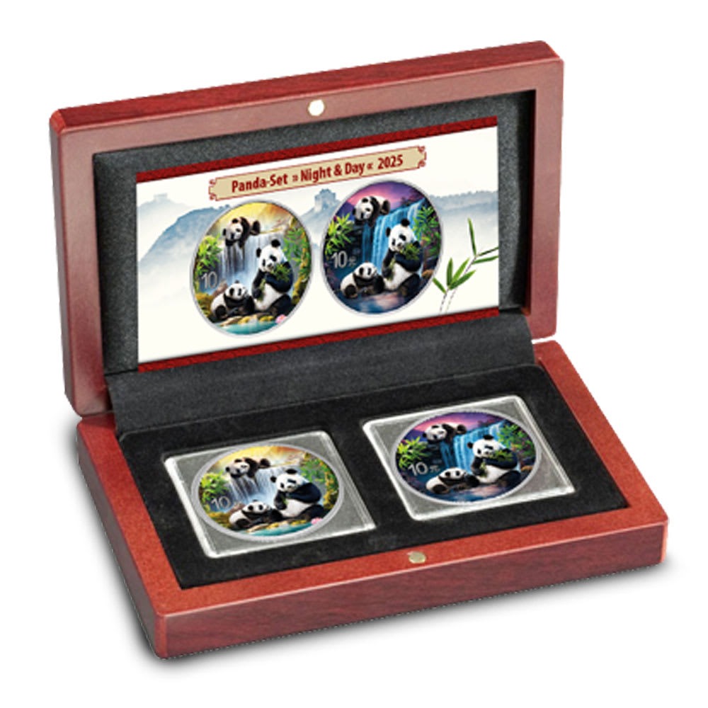 The Chinese Panda bullion series is popular for its use of new Giant Panda designs with each release date, a practice that has been in place since the 1982 debut of the series and which has only been skipped once in the program’s history. While the standard BU coins in the series are popular with investors and collectors, the series also boasts unique colorized coins that capture the attention of collectors each year. Right now, 2025 30 Gram Chinese Silver Panda Day and Night Two-Coin Sets are available.