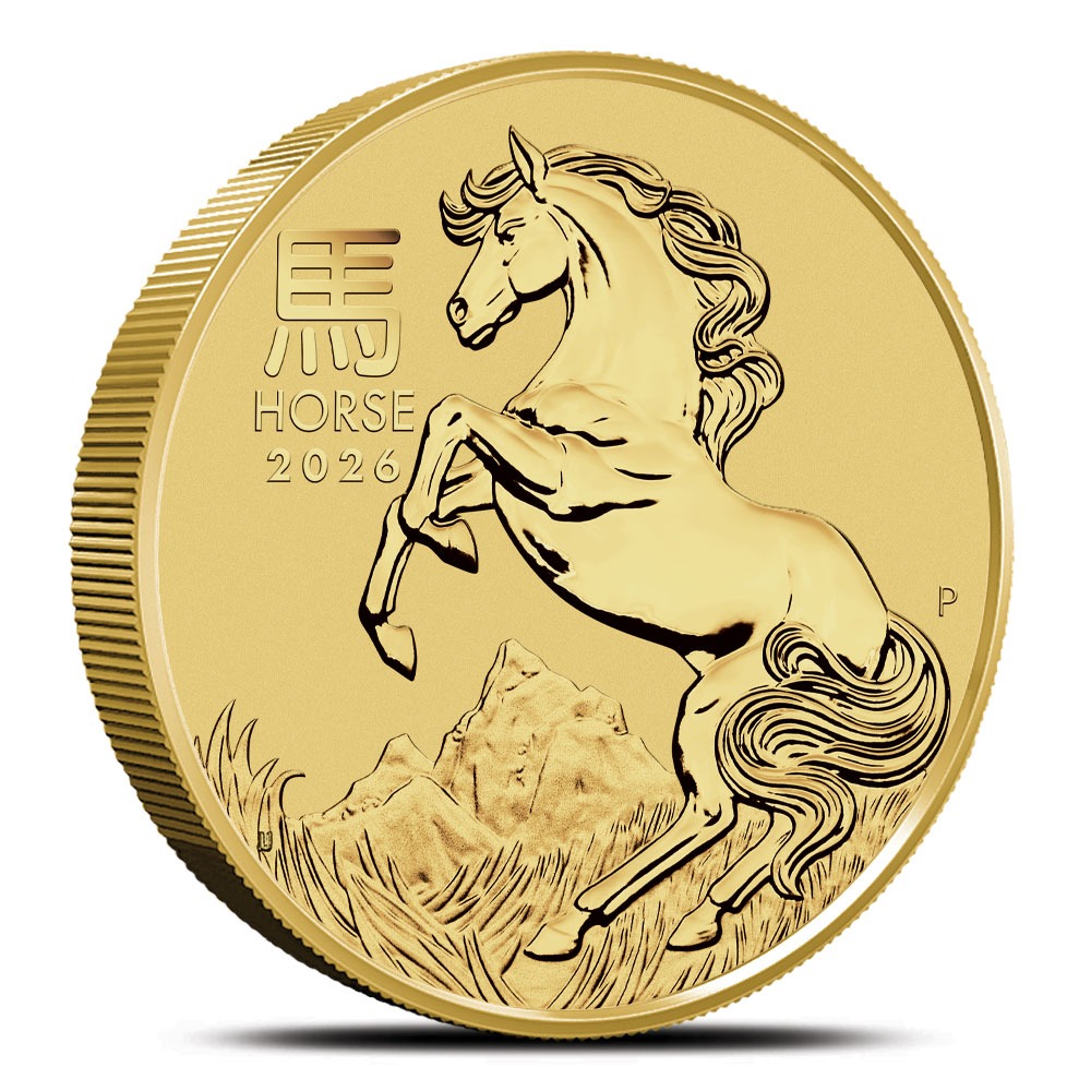 Perth Mint continues its homage to the Chinese Zodiac with the ongoing Lunar Series III. This series highlights all twelve animals of the zodiac, delivering new artwork with each release. Gold and silver coins are designed independently, with silver coins often presenting two animals, while gold coins emphasize a single animal. Today, 2026 10 oz Australian Gold Lunar Horse Coins are available.