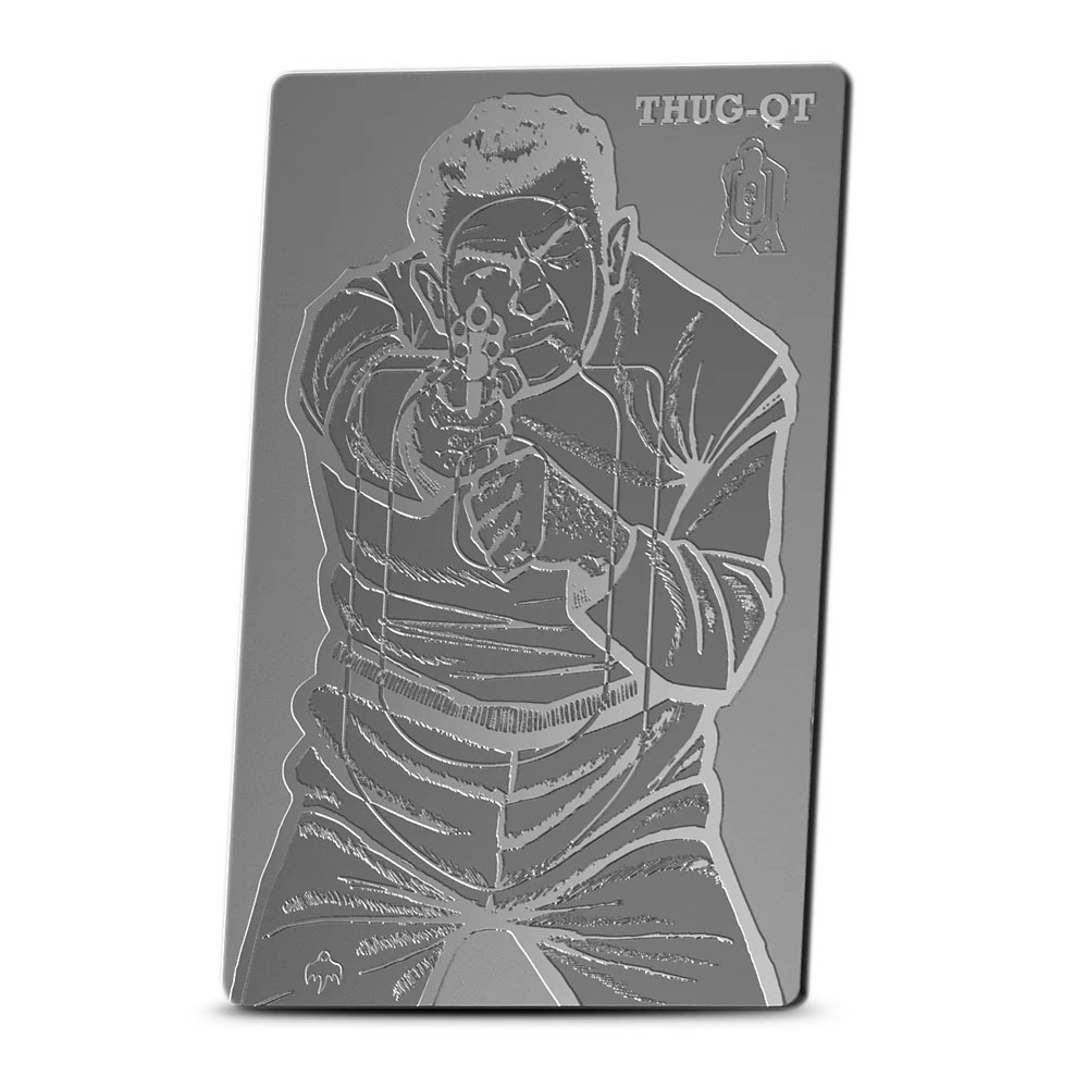 Human silhouette targets have been used in firearms training since the early 20th century, with the development of standardized target designs for military and law enforcement use. These targets evolved from simple geometric shapes to more realistic human outlines that helped shooters practice accuracy on center mass and vital areas. This rectangular silver coin presents the Thug-QT training sheet, featuring the silhouette of an armed shooter. Now, 2026 2 oz Prof Niue Silver THUG–QT Coins are available online.