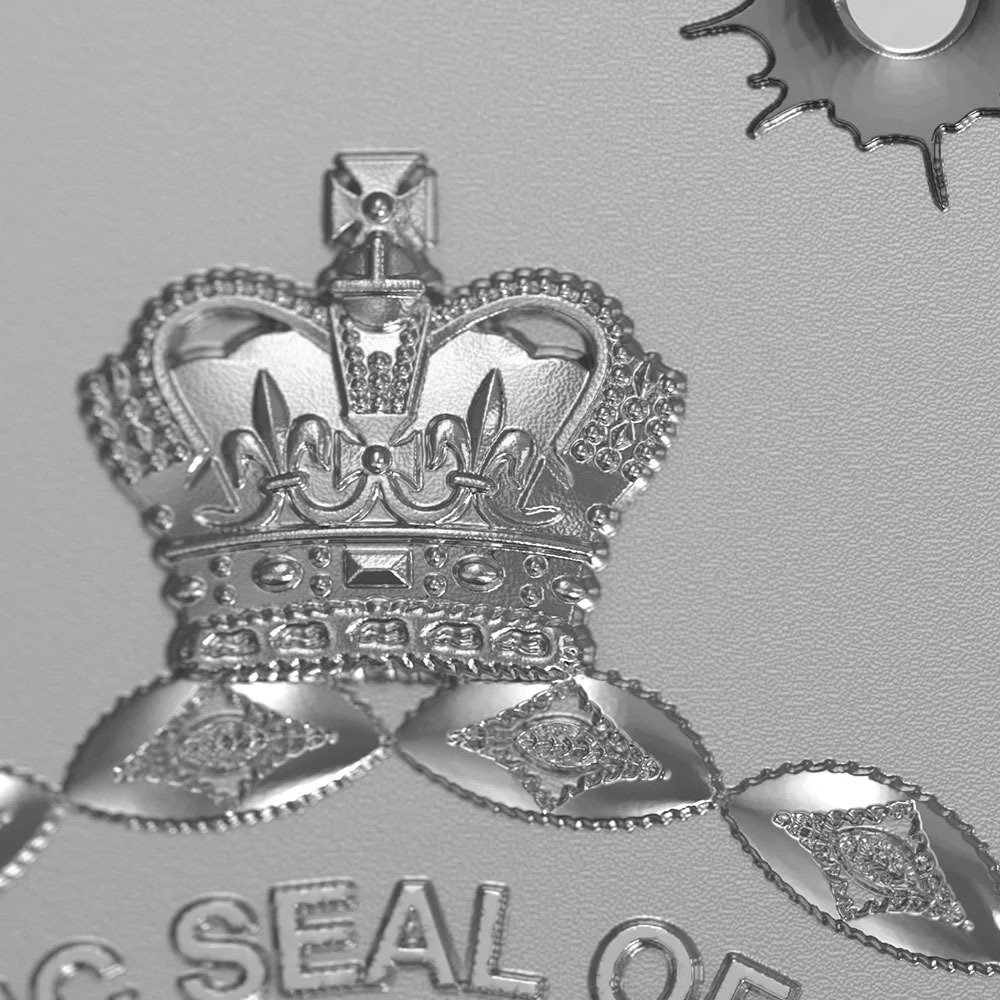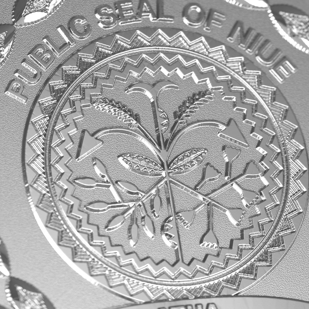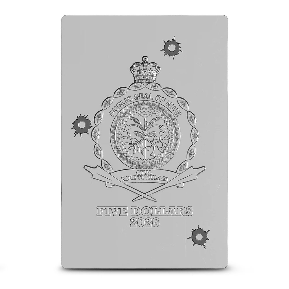 In the obverse design of 2026 2 oz Proof Silver THUG-QT Coins, you will find a depiction of the Public Seal of Niue. The national coat of arms for Niue features a ring of seashells around native flora with a Sovereign crown overhead. The field includes bullet holes, reflecting the rounds that would theoretically have gone through the target.